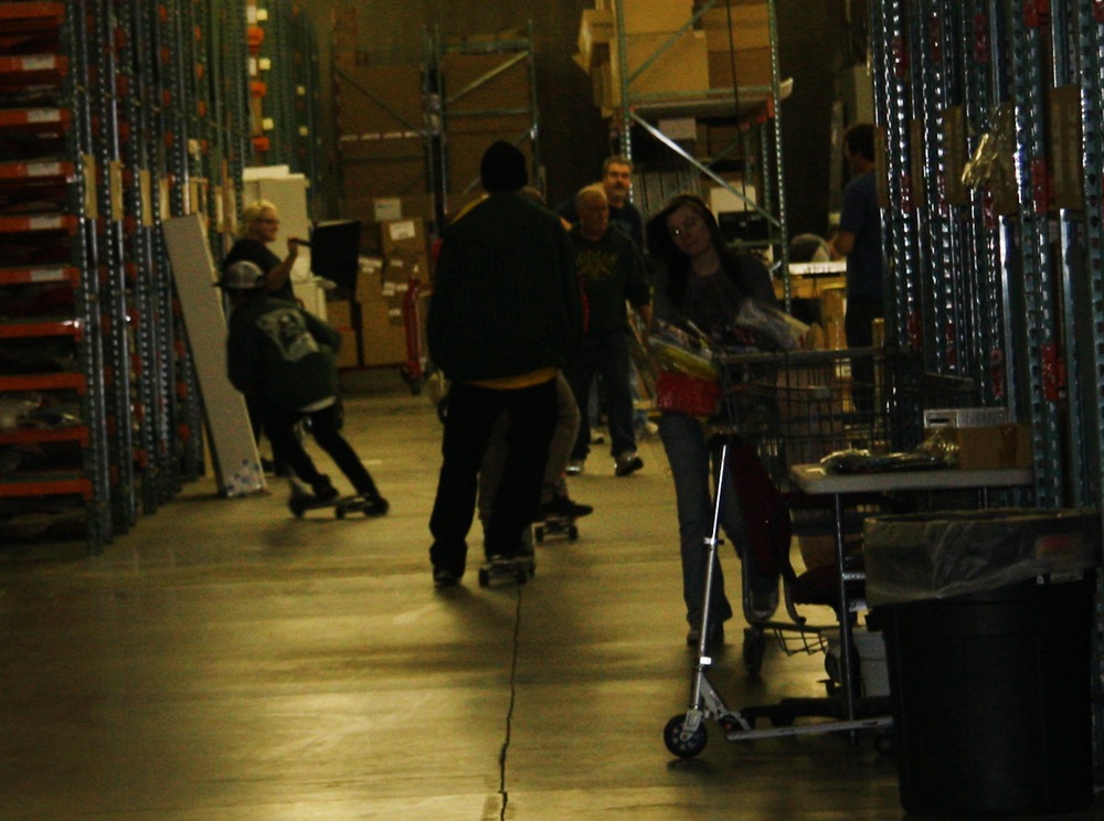 The people working in the warehouse weren't too thrilled when the guys found the scooters and were cruisin by going at least mach 3