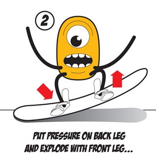 Shift your weight towards the back foot, load the tail, and allow the flex of the board to pop you off the snow. As you’re popping into the air, pull your knees up for maximum vertical, and extend your legs down toward the snow as you approach the landing.