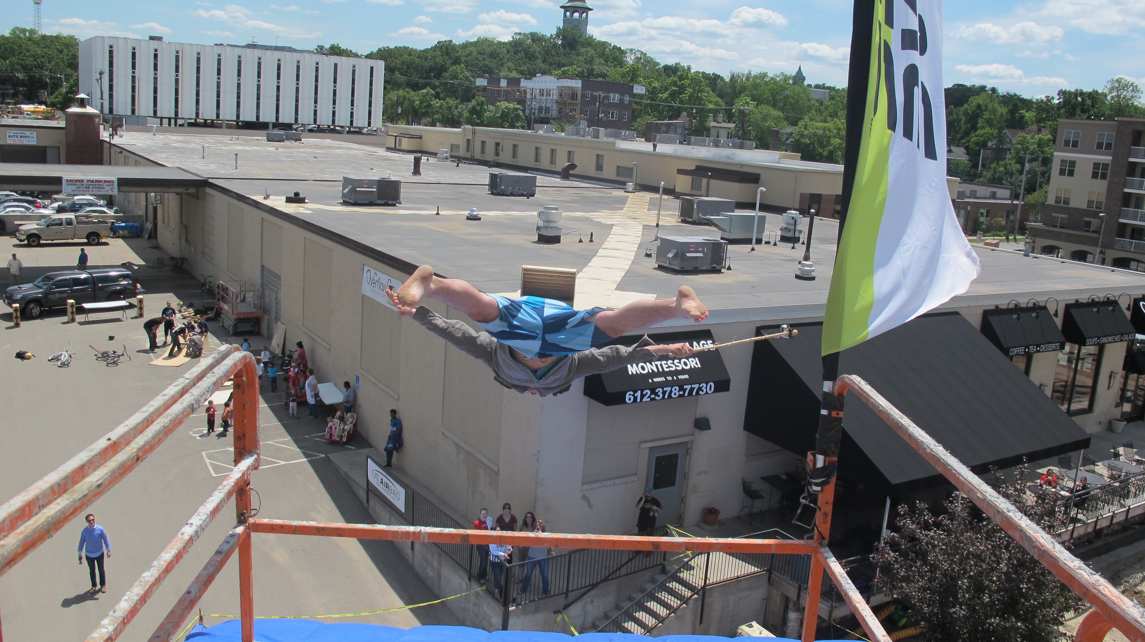 Local TV station WCCO came out last week to cover the latest US Airbag event, “Leap For Local Business”. The event was held in an effort support local business that have been impacted by the Light Rail Construction in Minneapolis. Local adrenalin junkies were able to get their kicks by jumping off the a 40 foot scissor lift into a air bag or as they like to call say, “Soft Landings For Superheros.” The highlight of the event, besides jumping, was watching local BMX Crew, Twin Cities Fancy Factory, launch thems self off two story building into the Airbag. Despite the apparent danger no one was hurt during the event and I would highly recommend taking the leap, when an USAirbag event comes to a city or resort near you.