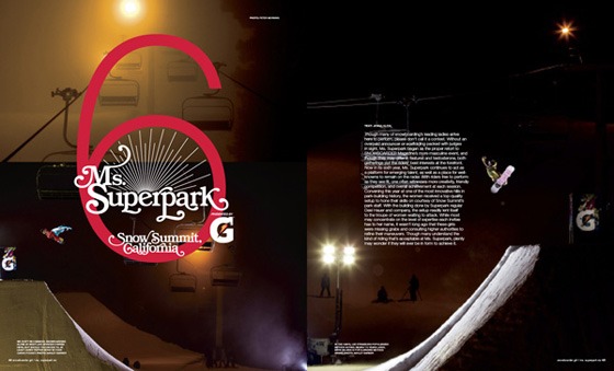 “Though many of snowboarding’s leading ladies arrive here to perform, please don’t call it a contest. Without an overpaid announcer or scaffolding packed with judges in sight, Ms. Superpark began as the proper retort to SNOWBOARDER Magazine’s more masculine event, and though they may differ in features and testosterone, both gatherings put the riders’ best interests at the forefront. Now in its sixth year, Ms. Superpark continues to act as a platform for emerging talent, as well as a place for well-knowns to remain on the radar. With riders free to perform as they see fit, one often witnesses more creativity, friendly competition, and overall achievement at each session. Convening this year at one of the most innovative hills in park-building history, the women received a top-quality setup to hone their skills on courtesy of Snow Summit’s park staff. With the building done by Superpark regular Desi Hauer and company, the setup readily lent itself to the troupe of women waiting to attack. While most may concentrate on the level of expertise each invitee has to her name, it wasn’t long ago that these girls were missing grabs and consulting higher authorities to refine their maneuvers. Though many understand the kind of riding that’s acceptable at Ms. Superpark, plenty may wonder if they will ever be in form to achieve it.” -Jenna Klein