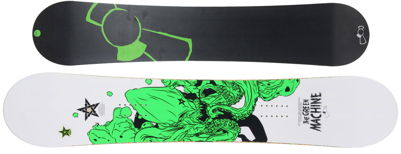 Dave here at The House talking about the Capita Green Machine snowboard. (Hmmm!) What you’re looking at here is, basically, Capita’s most eco-friendly construction. What you’re going to have is a biodegradable bean topsheet, kind of somewhat what the Mervin guys are using. It’s not that really it’s not really that toxic, super glossy topsheet crap you see the other companies are pumping out, definitely, it’s got to be a little bit more eco-friendly.
