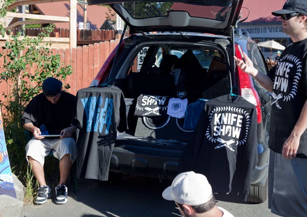 They had set up shop straight out of their car right outside the High Cascade skate park selling swag like stickers, T-shirts, sweatshirts and a few other assorted things. Evidence would show later that that wast the best place in town to sell your gear as every single kid on the hill was rocking the Knife Show logo.